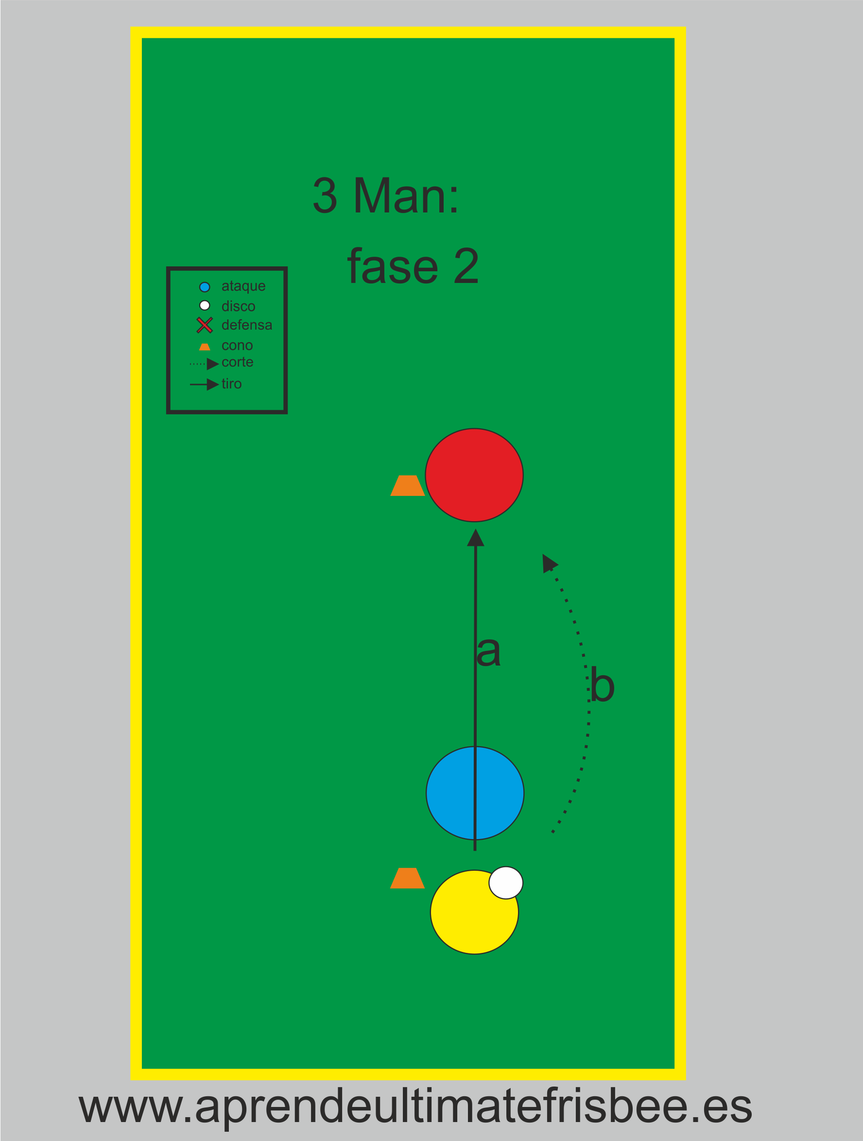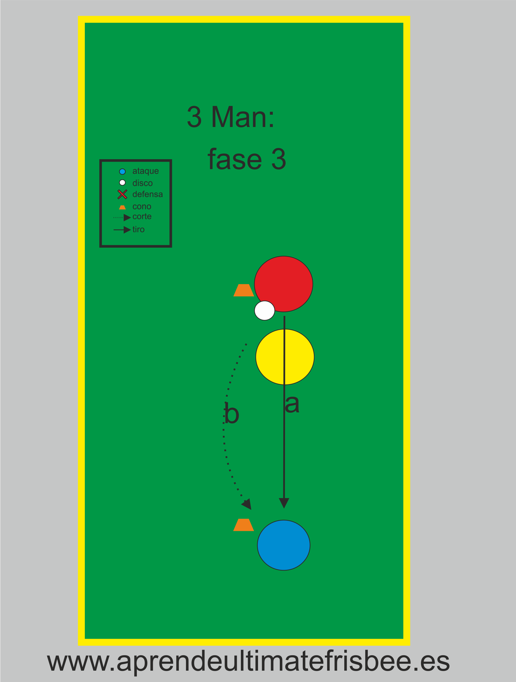 Amarillo tiene el disco es defendido por el Azul ,debe lanzar (a) al jugador Rojo y luego ir a defenderlo (b).