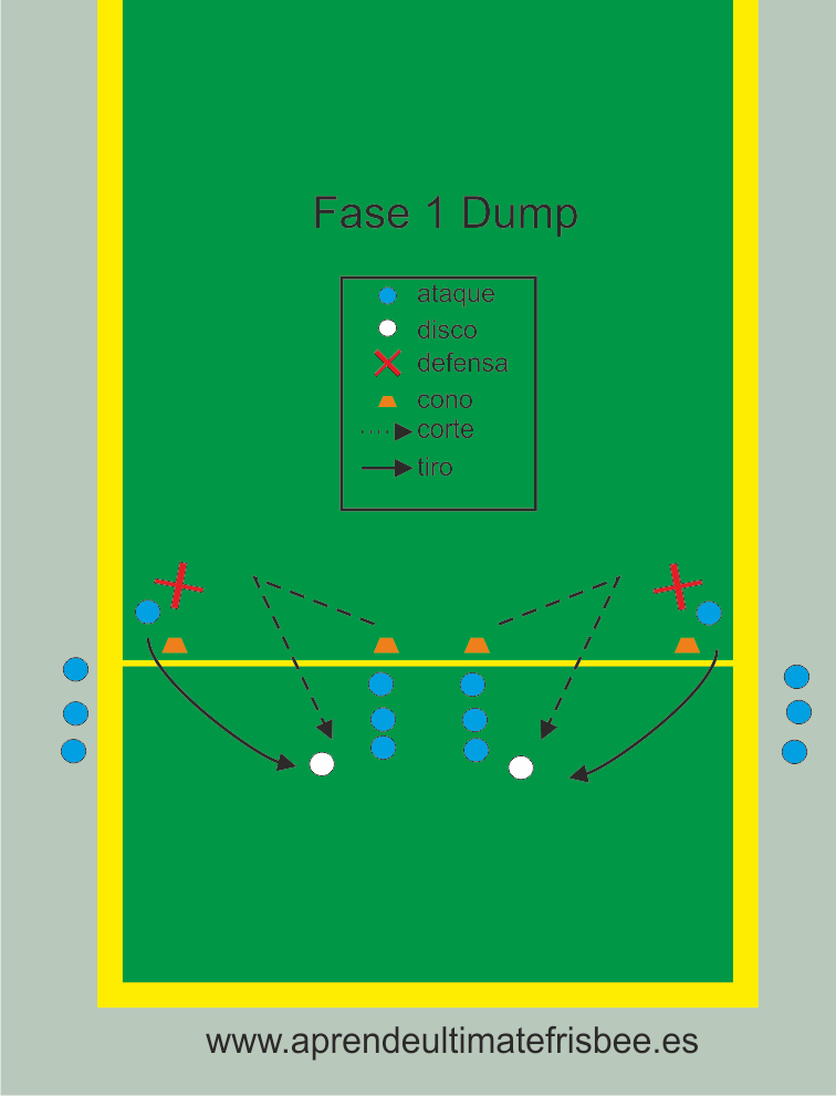 Fase 1 Dump: realizamos una carrera de dos metros hacia delante del jugador para luego volver hacia atras ,asi el lanzador podra realizar una finta hasta poder hacer un tiro directo al jugador el cual recibira en la posicion llamada «Dump».