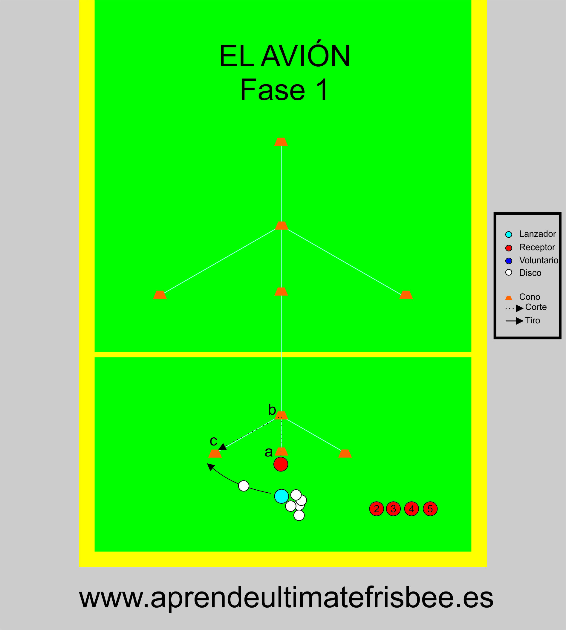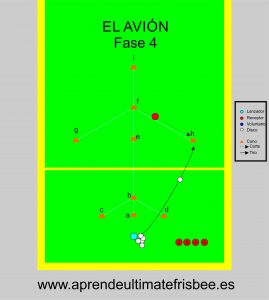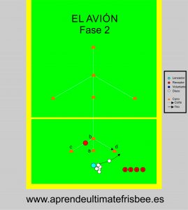 - El lanzador debe tirar el disco hacia el cono «c» de manera que coincida en el momento que el receptor pasa por él.El receptor recibe el disco y lo suelta en el sitio, inmediatamente vuelve al cono «b» iniciando el movimiento de la fase 2.