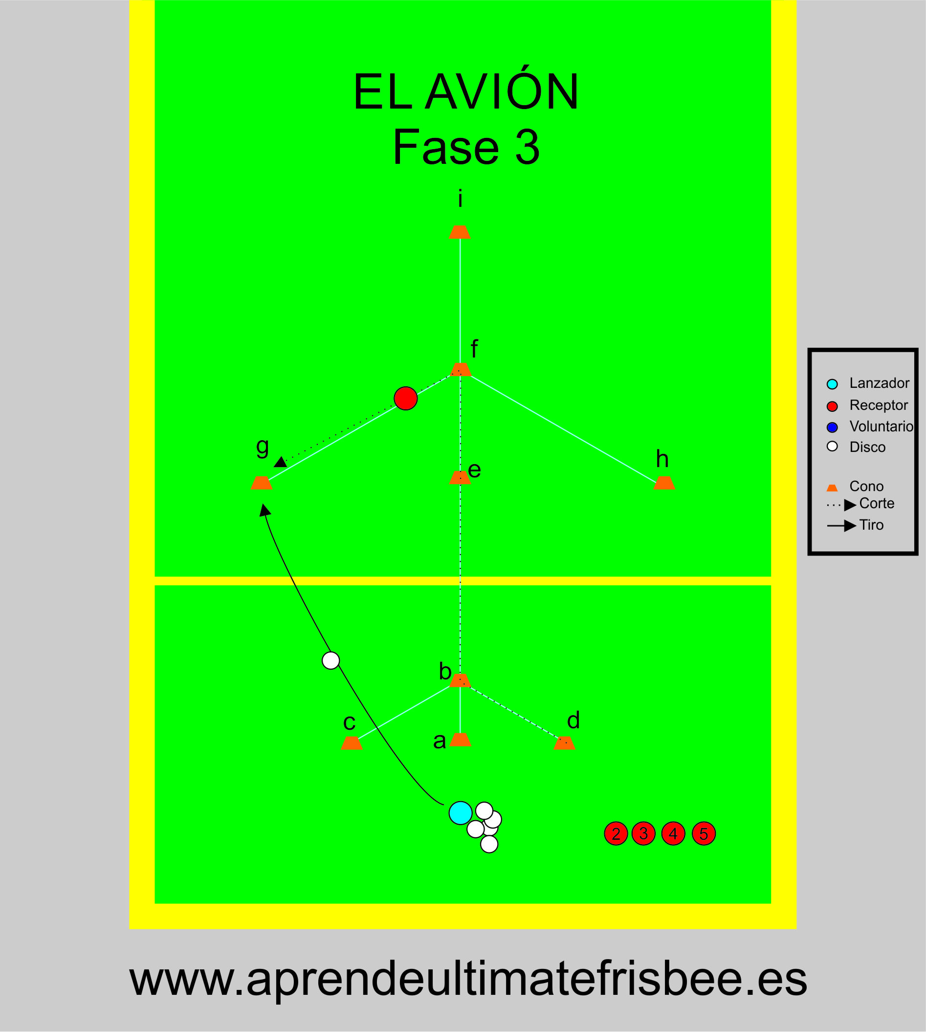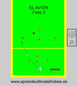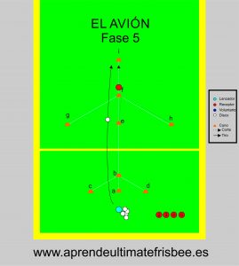 El lanzador debe tirar el disco hacia el cono «g» de manera que coincida en el momento que el receptor pasa por el.