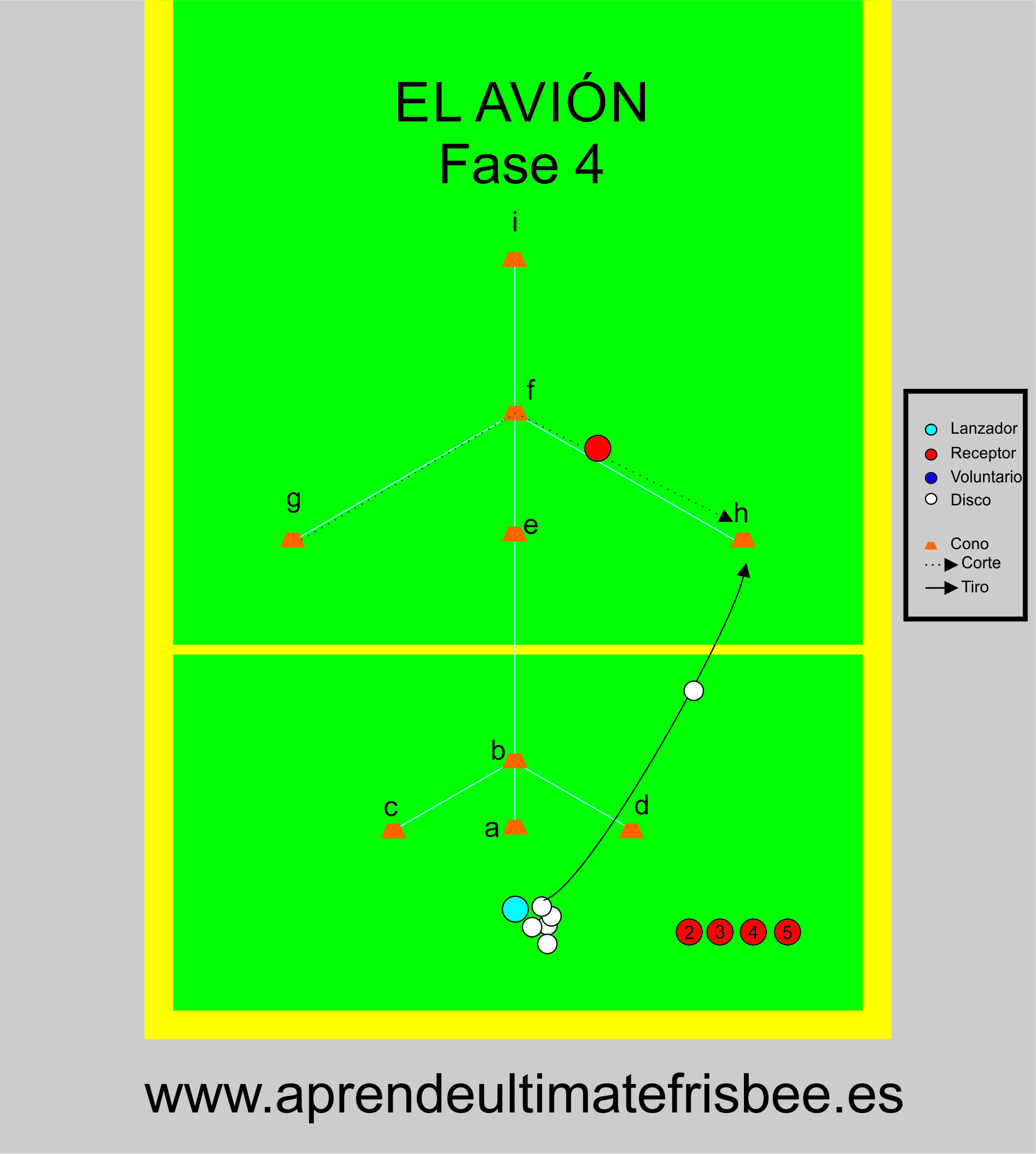 El lanzador debe tirar el disco hacia el cono «h» de manera que coincida en el momento que el receptor pasa por el.