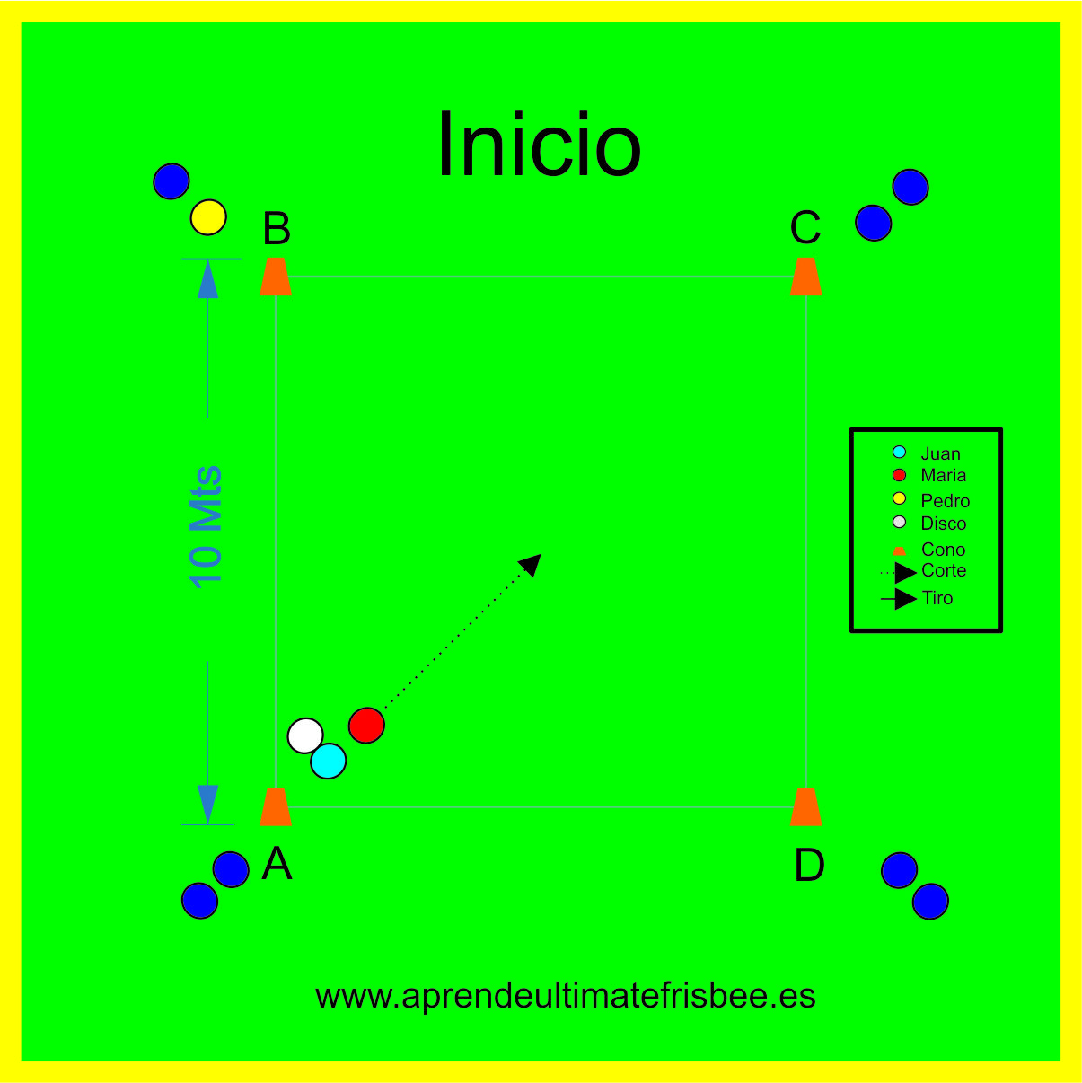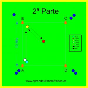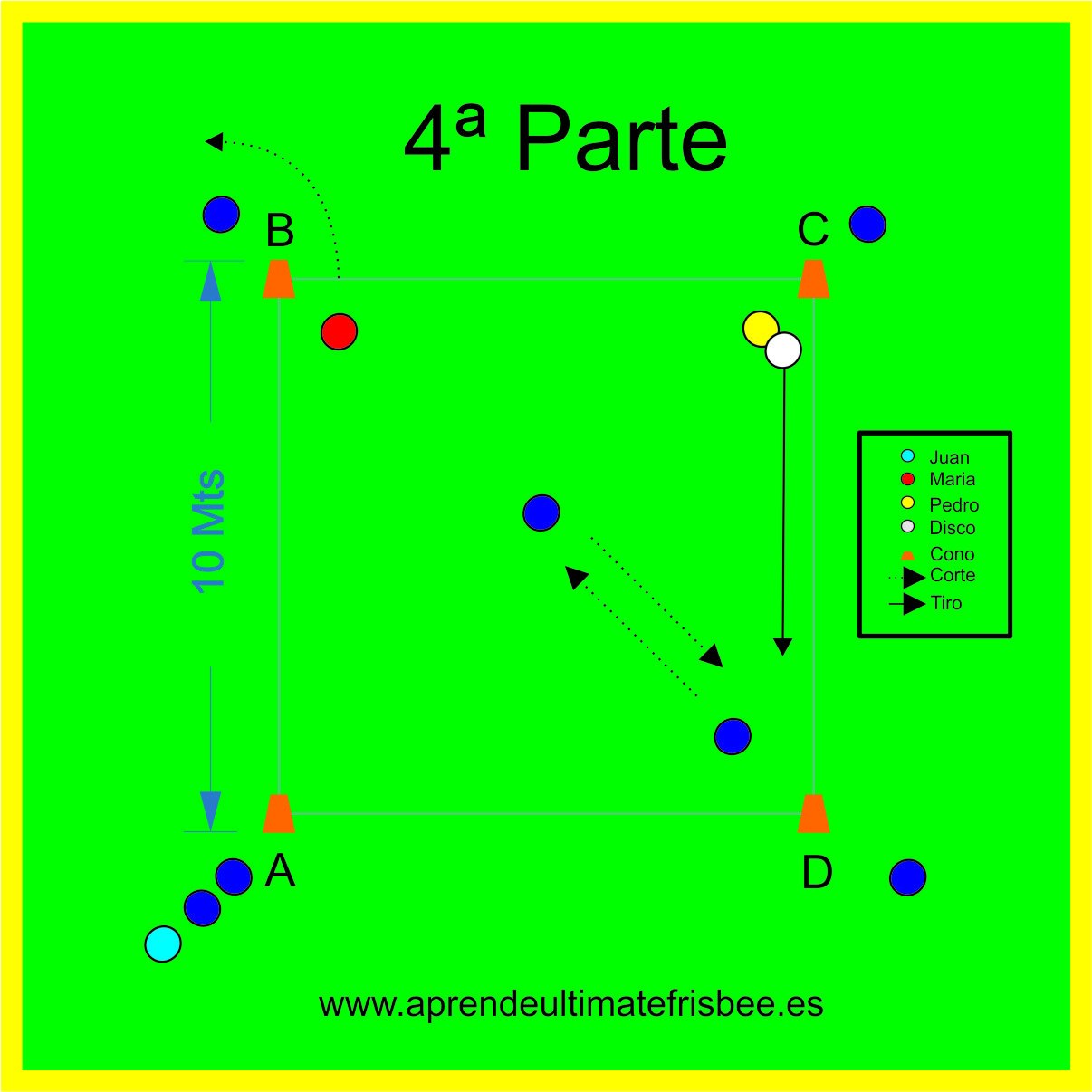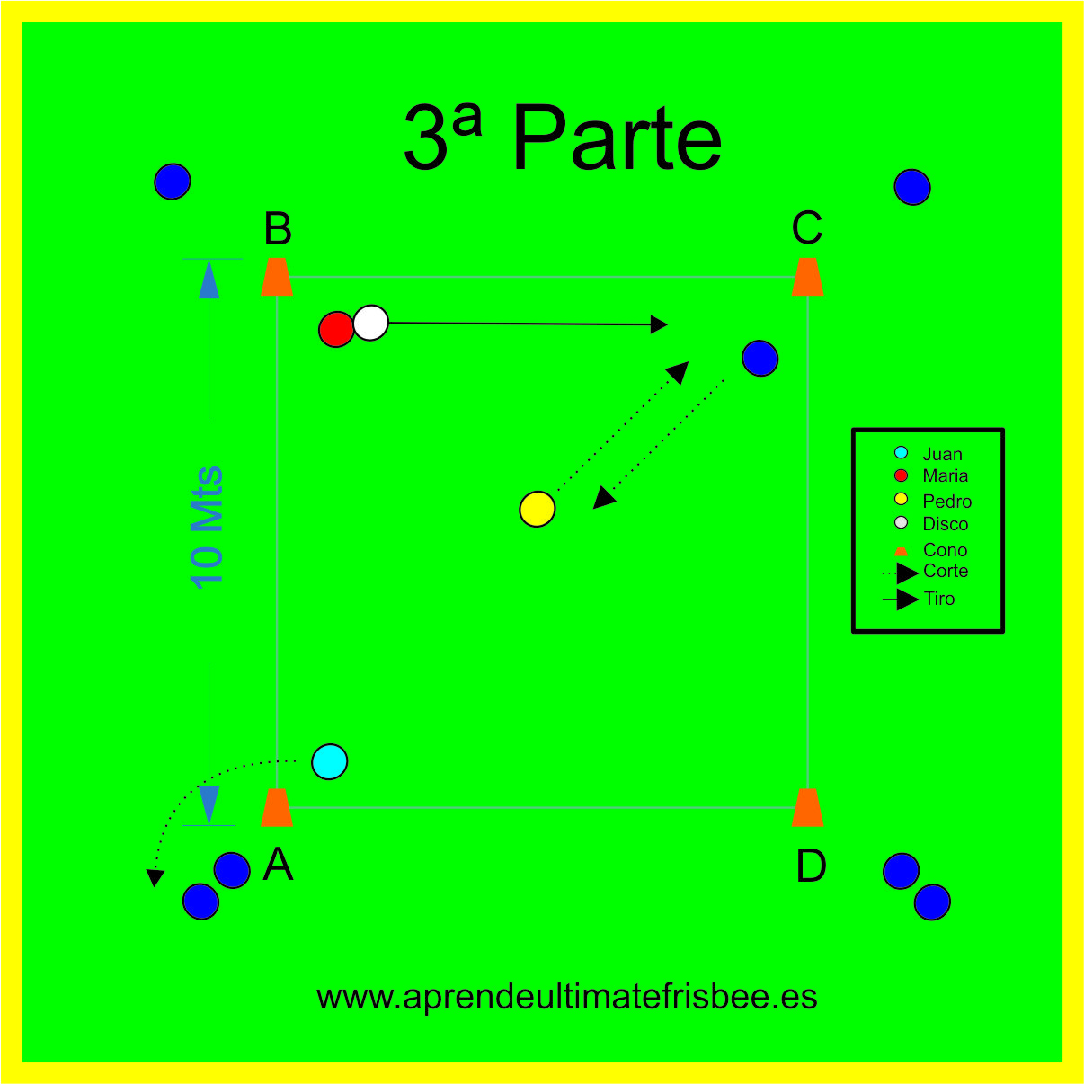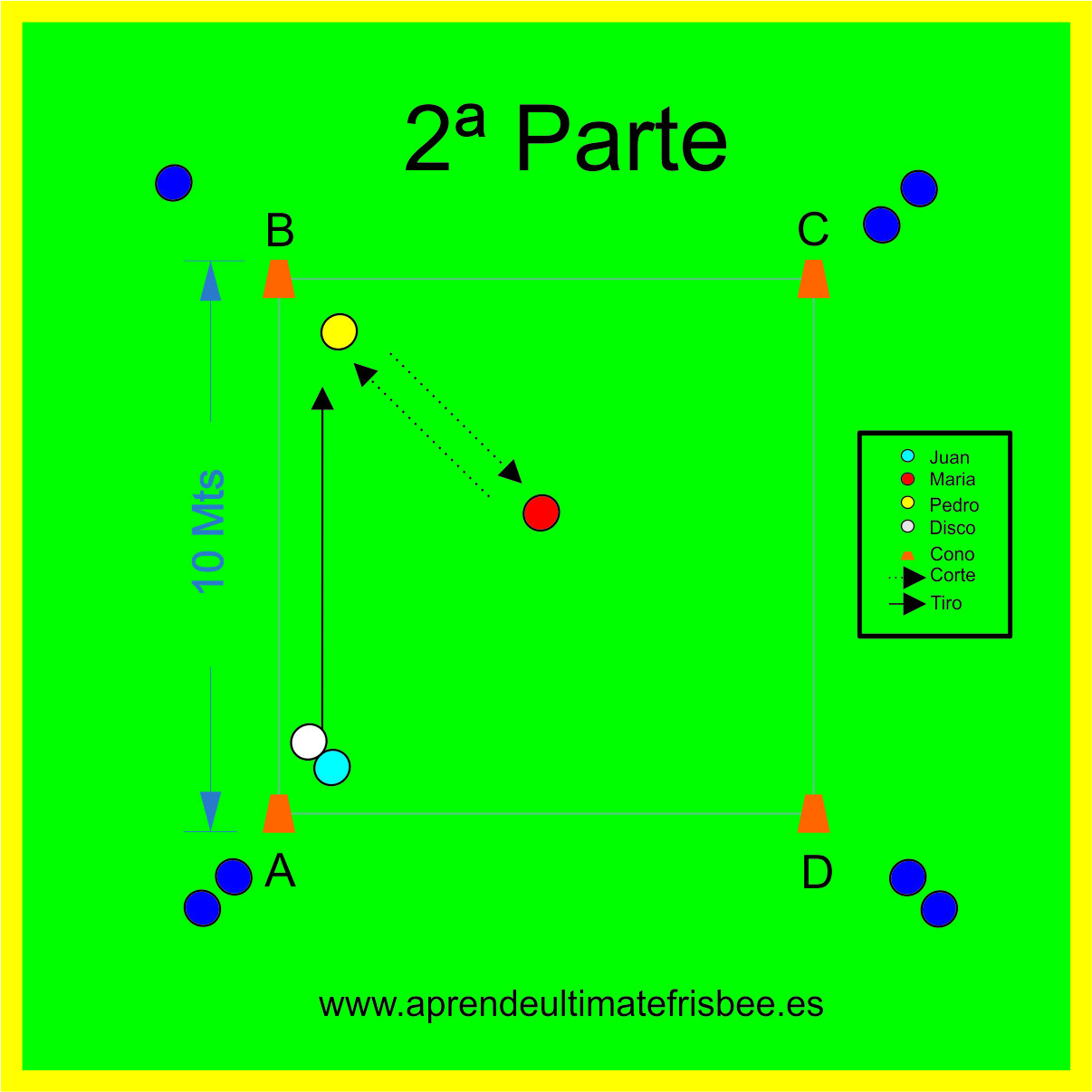 Mientras María termina su corte hacia el cono B; Pedro empieza a realizar su carrera hacia el centro de la caja . Juan lanza el disco hacia la carrera de María , tanto Juan como María deben buscar que el disco sea recibido a la altura del cono B.