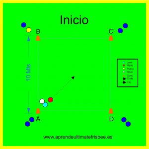 Para dar inicio al ejercicio todos los participantes se distribuyen de manera equitativa entre los 4 conos (no pasa nada si sois impares), Juan tendrá el disco en el cono «A » y María partiendo desde esta misma posición hará un corte (correrá hacia el centro de la caja y cambiará de dirección hacia el cono «B»).