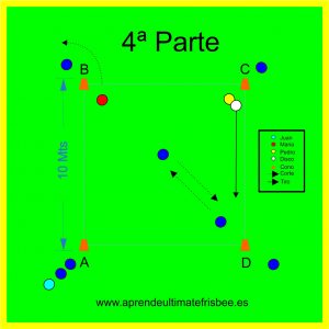 Ahora Pedro tiene el disco. El Jugador de columna «D» inicia su carrera hacia el centro para realizar su corte hacia el cono «A» . El jugador que estaba en la columna «C» realiza el corte y recibe el disco en frente de la columna «D» lanzado por Pedro.