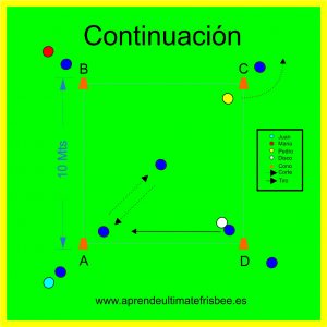 Ahora María tiene el disco en frente del cono «B»; el jugador de la columna en el cono «C» empieza su carrera hacia el centro del cuadro (para luego hacer el corte hacia el cono «D») .